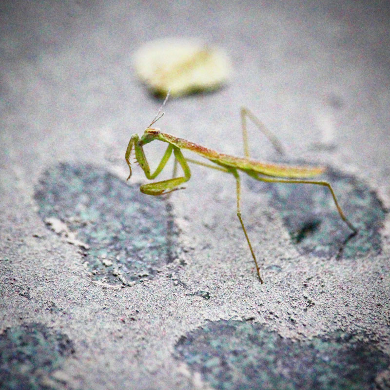 石彫の現場に迷い込んで石の粉だらけになったカマキリの子どもが鎌を舐めてる。体長約22mm