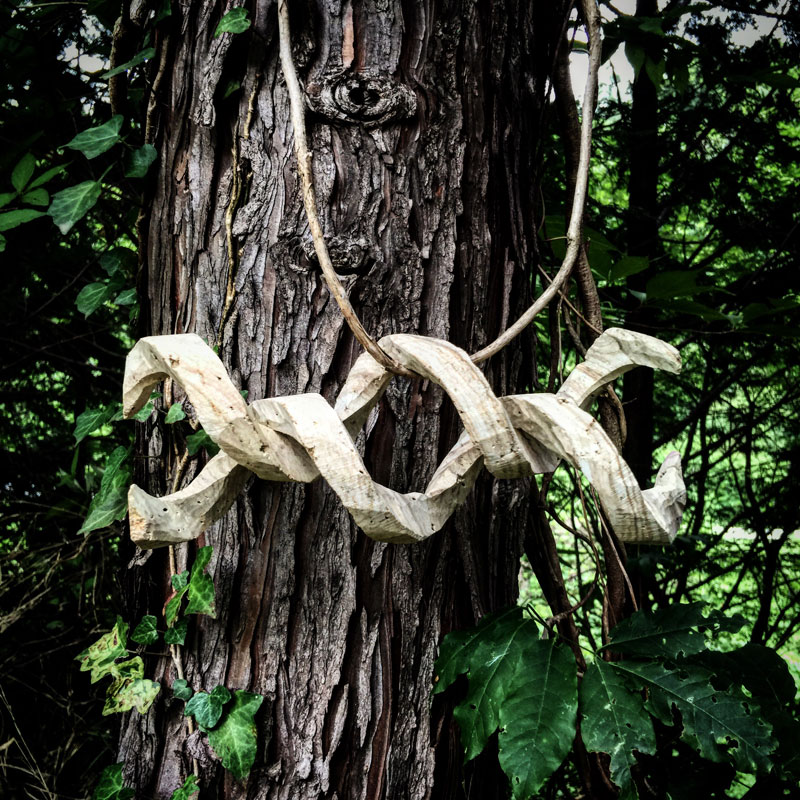 いただいた天草木目石で作った二重螺旋 (double spiral) を二重螺旋だらけの仕事場の木の弦に絡ませてみた。