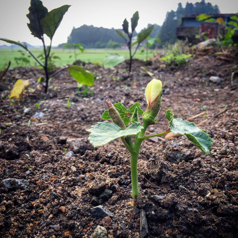 こんな小さいのにもう花と蕾が。植えるの遅かったからなぁ。花とってしまえばいいのかなぁ、オクラ。
