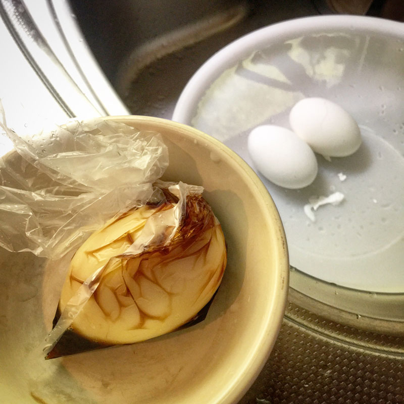 ひとつは味付け卵に。たっぷりの水を張ったボウルの中で空気を追い出しながら袋を縛れば、少しの醤油でも、漬け込んだようにできて無駄にしなくて済む。温かいままで冷やさなければ半日で味も入る。