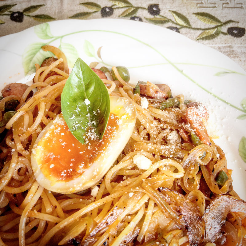 昼食に昭和の喫茶店風ケチャップのナポリタン作る。朝、仕事前に作っていった味付けの半熟卵をトッピング。温かいままで醤油に入れたから充分過ぎるくらい色も味もしみてる。