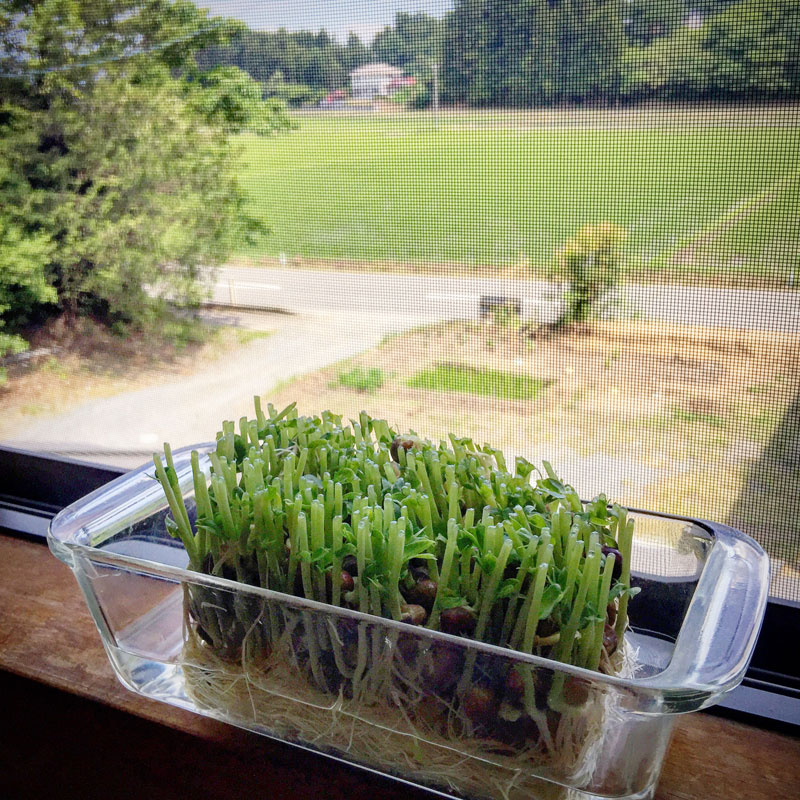 豆苗のナムル作った。冷蔵庫で半日。味がしみたらできあがり。いただいたニンニクを醤油に漬けておいたのでちょうどよかった。