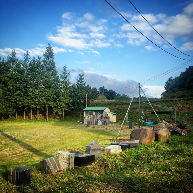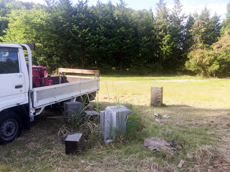 友だちにもらったユニック車で、在庫の石の整理終わった。分散していた石を全て脇に一列に並べて広々。