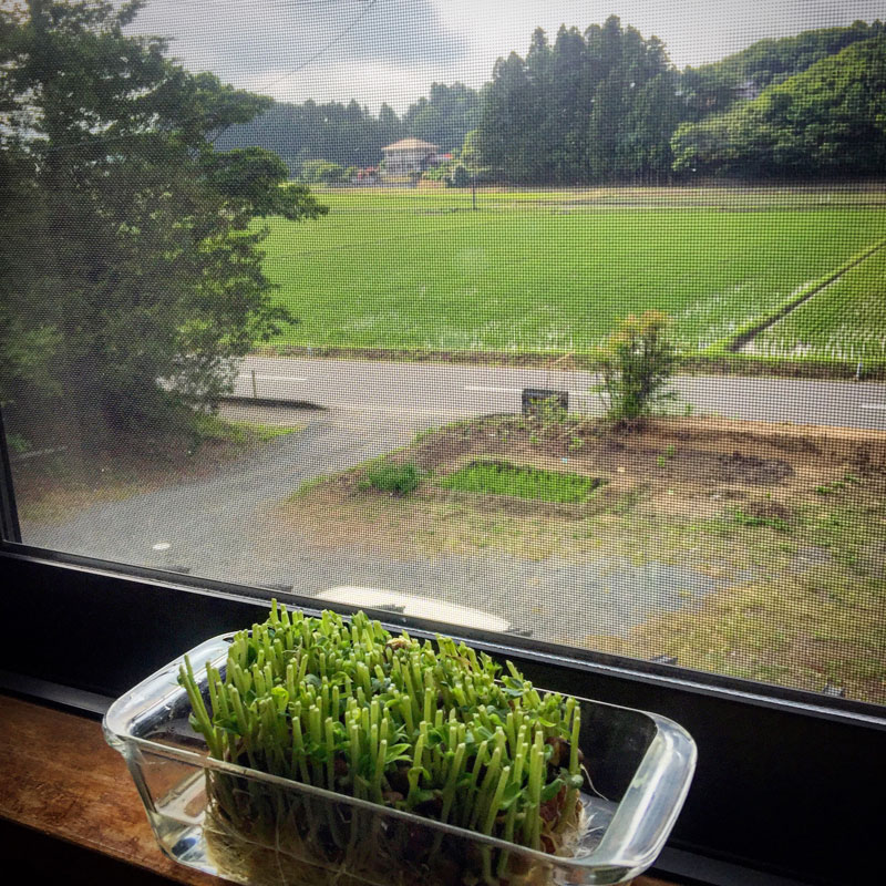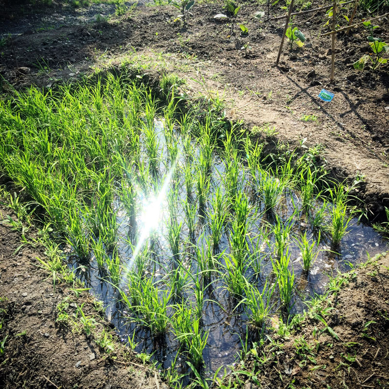 今朝の庭の一畳田んぼと猫の額畑。げんきまる(稲)ニラ、だだちゃ豆(枝豆)ナス、ピーマン、パプリカ、オクラ、パセリ、きゅうり、ルッコラ、バジル、サラダセット(エンダイブ、チコリ(赤、青)、サニーレタス、グリーンリーフ、サラダ菜、クレソン)