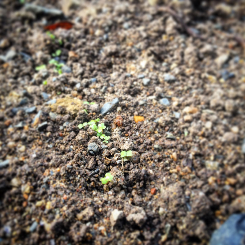 ルッコラの発芽。6年前の種は芽が出なかったので買い直した。間引きしながらルッコラたっぷりのサラダが食べられるぞ・嬉