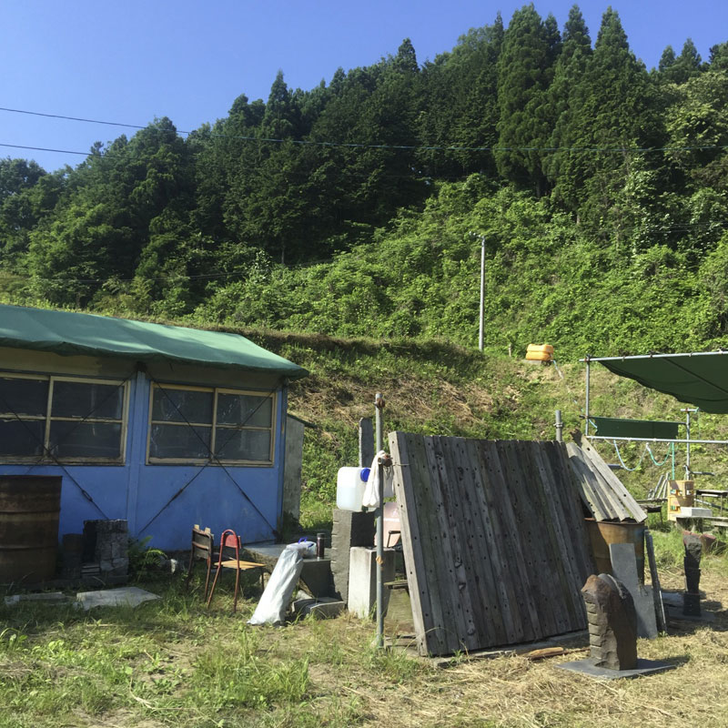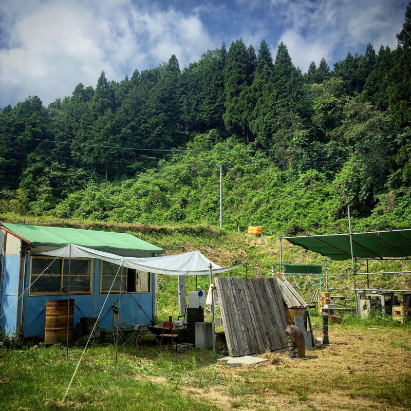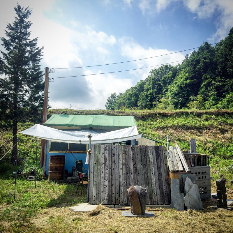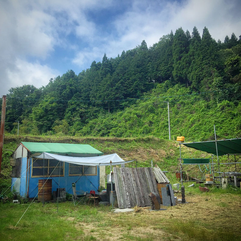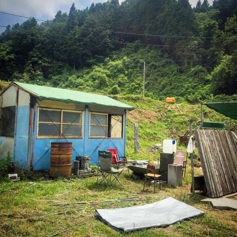 昔、姪っ子が夏休みに遊びに来ていた時に、部落の夏祭りで当てたタープもらった。それを仕事場に持ってきた。