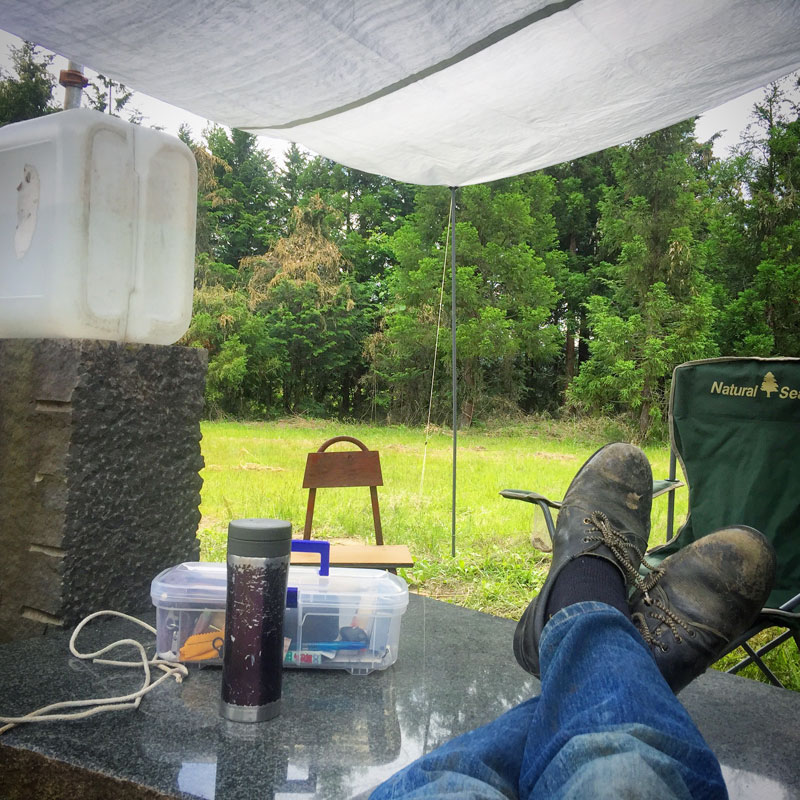 仕事場の石テーブルの上にタープ張った。今日は石テーブルでカミさんとランチ。いつも日焼けを気にしてるから、タープが張れるように石テーブルの位置を変えて組み直した・笑