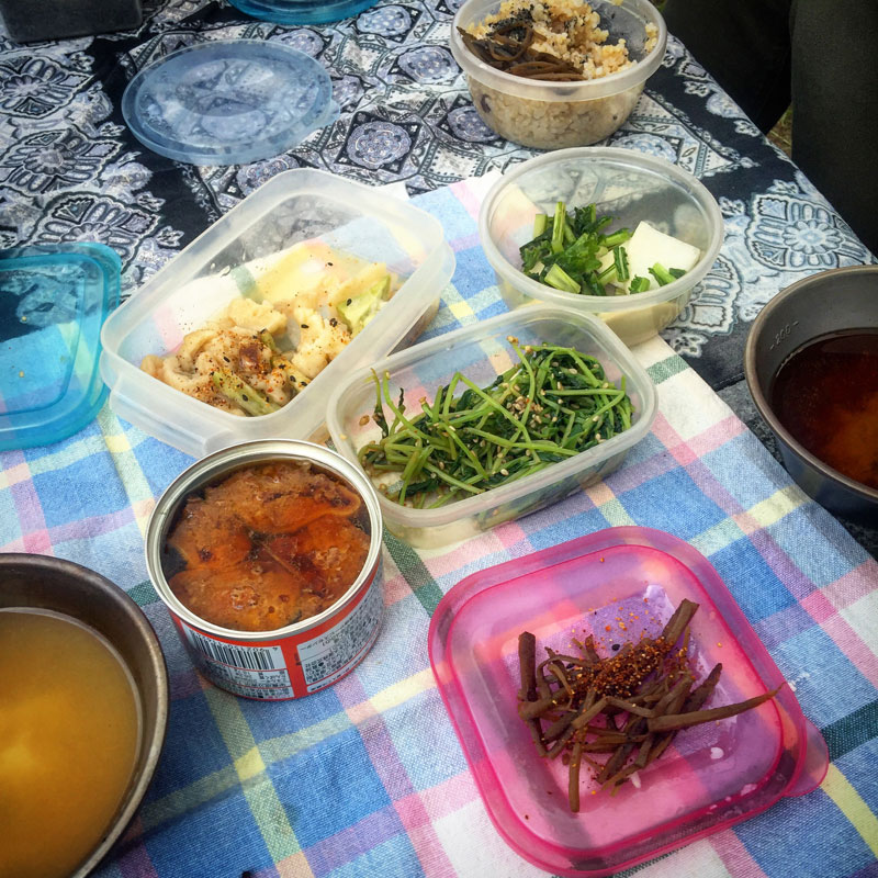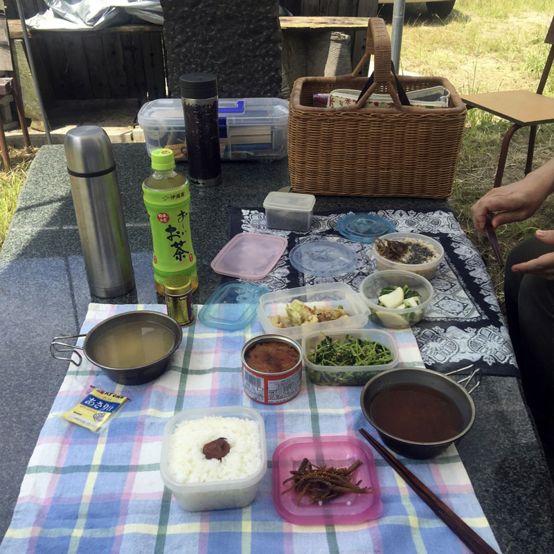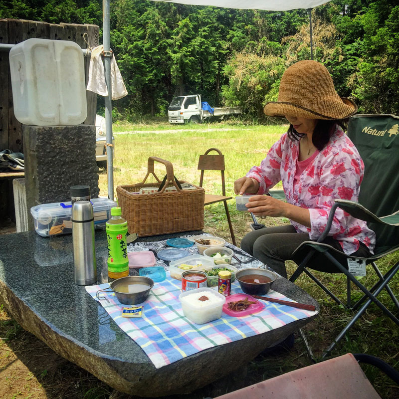 昼食後、タープ撤収!午後の仕事。カミさんは車の中で読書してる。
