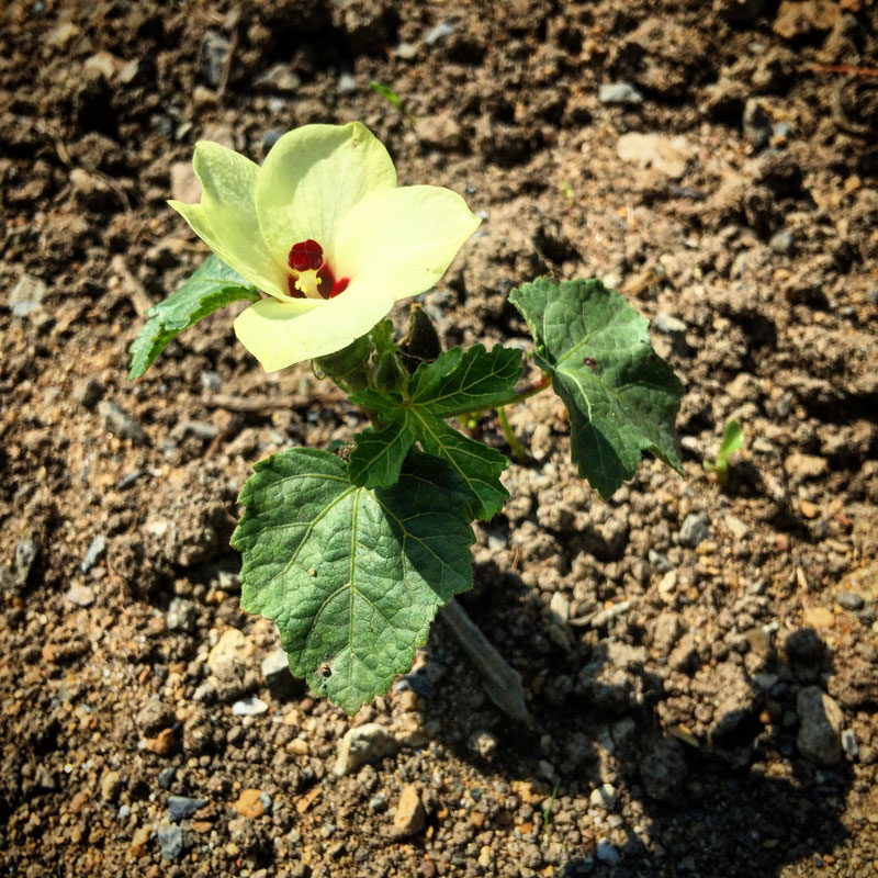 庭の猫の額畑のオクラの背丈が異常にチビな件。(家だけじゃないみたいです。プロの畑も。空梅雨。ほとんど雨が降らない、そして高温。しかし地温は低い)