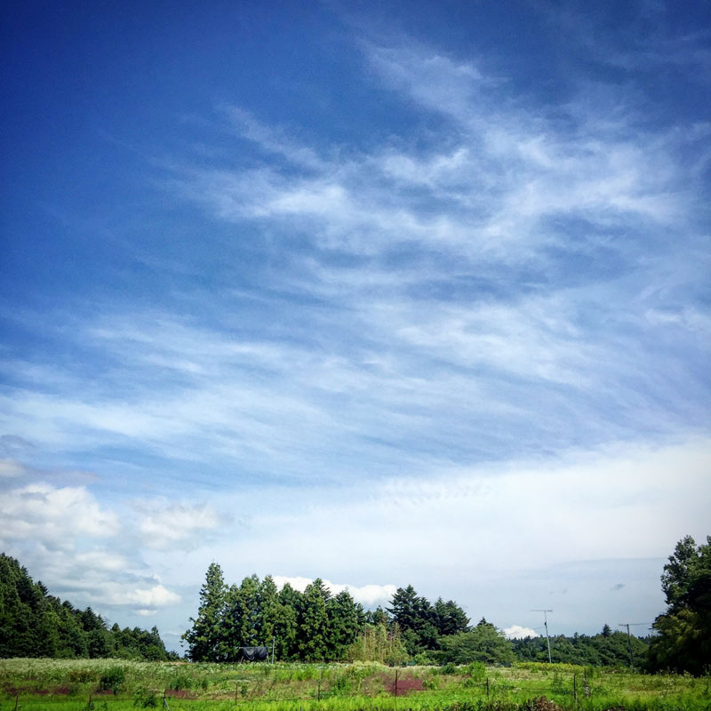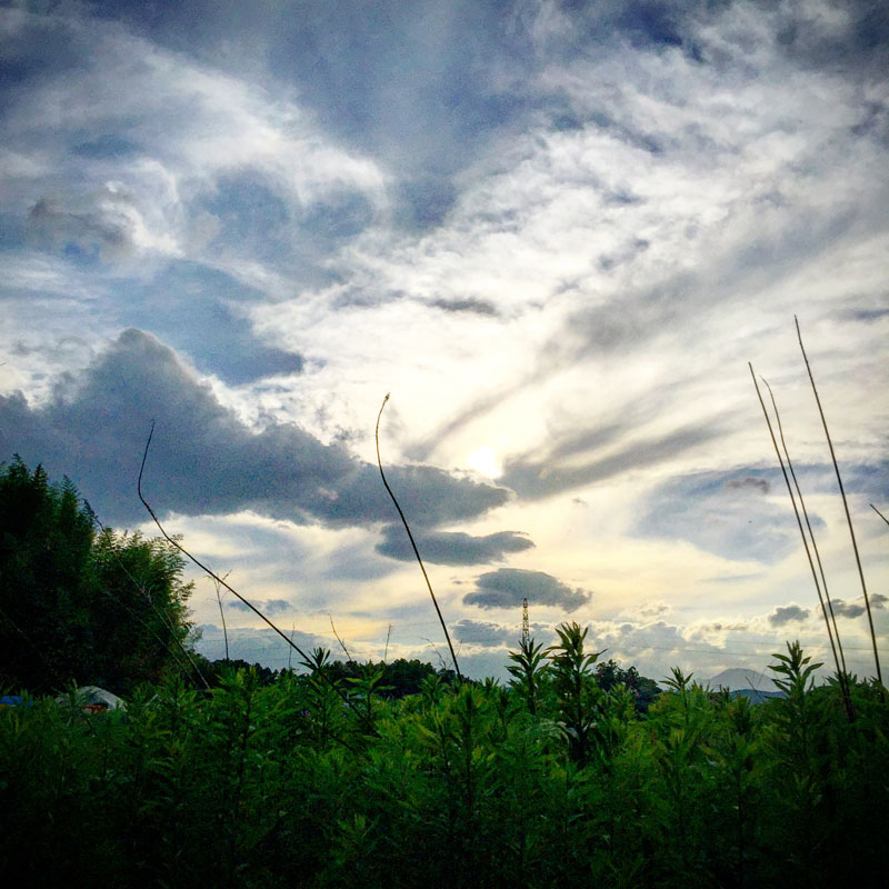 夕方、石彫りの手を止めて仕事場の草刈り。見上げた空。