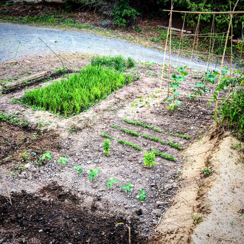 稲(げんきまる)、パセリ、ピーマン、パプリカ、モロヘイヤ、だだちゃ豆、きゅうり、ニラ、サラダ菜、ルッコラ、ほうれん草、オクラ、バジル、ニラ、万能ネギ。新たに大震災の年に植えようと思っていた6年前の種、大根と京仙菜、紫蘇などの種を蒔いた。多分、発芽しない。#庭の一畳田んぼ #庭の猫の額畑