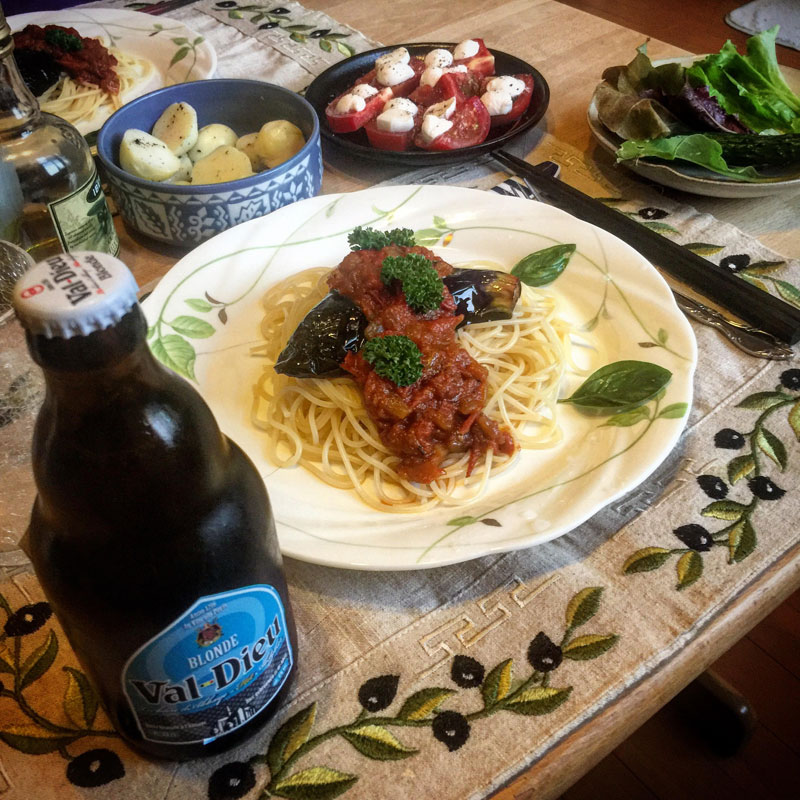居酒屋我家、開店。友だちのお百姓さんにもらった木で完熟したトマトで作ったトマトソースのパスタ、揚げナス添え。トマトとモッツァレラチーズ。サラダ。ほとんどの野菜が庭の猫の額畑の収穫物になってきた。