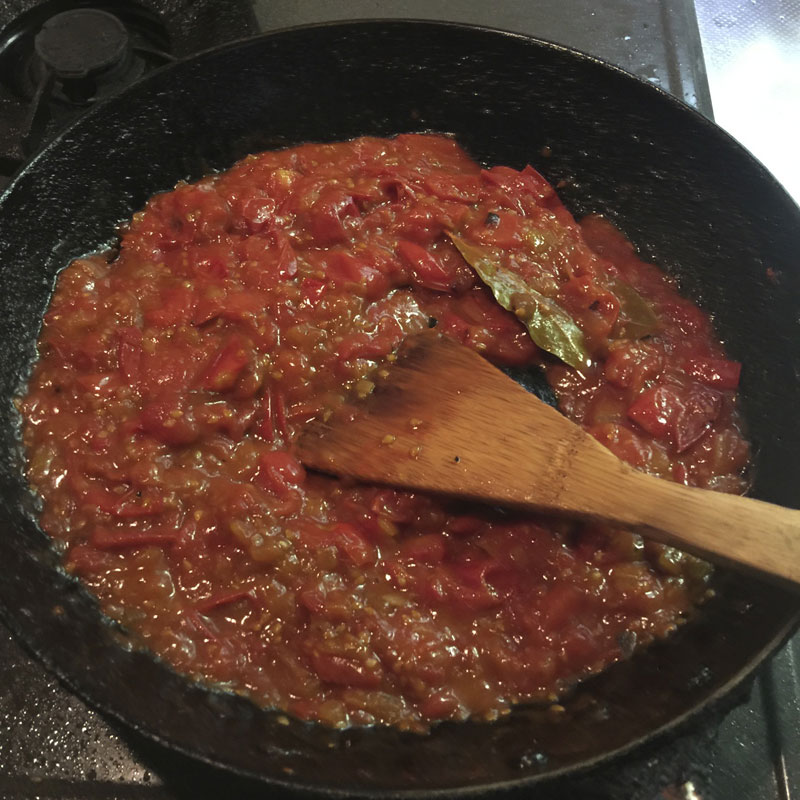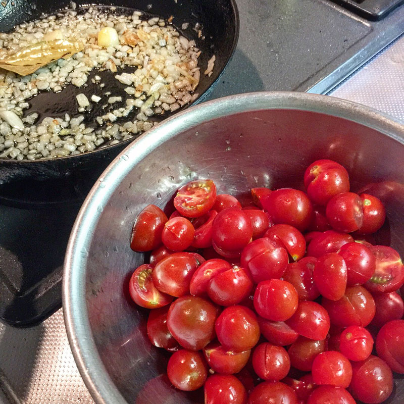 フライパンのみじん切りのタマネギがチリチリになってきたらトマトを入れる。写真を撮ってる一瞬で火が入りすぎてしまった(汗)でも、焦げる一歩手前まで炒めないと美味しくならない。