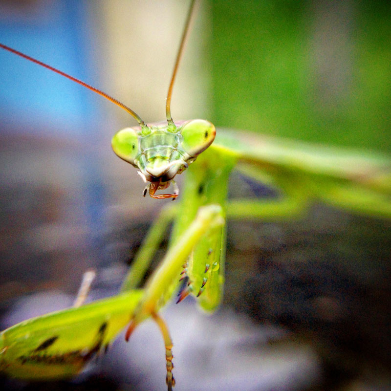 お食事中の雨の中のカマキリ。マクロで撮ったからでかく見えるけど、本当は数センチ。