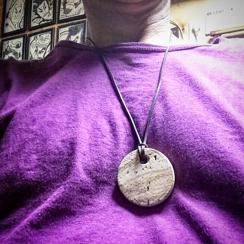 昼間天草木目石で作った「木星」のペンダントトップに皮ひも通してみた。これは自分用にして耐久性とかのテストしよう。
