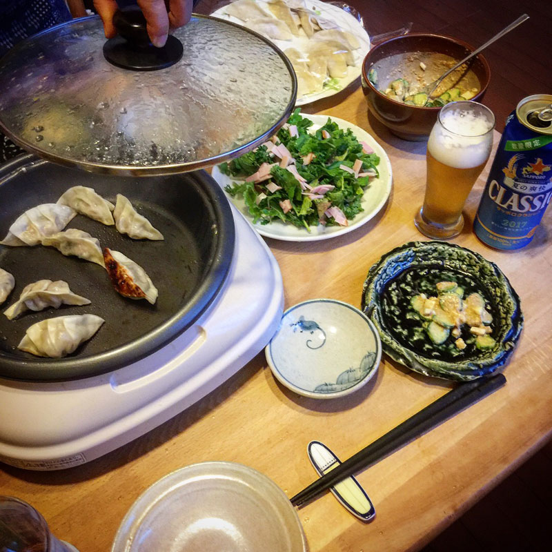 居酒屋我家、開店。カミさんが作ってくれた餃子を初めてホットプレートで焼いてみる。いつもは僕が鉄のフライパンで焼き担当なので、焼くのと食べるのと飲むので忙しかった。