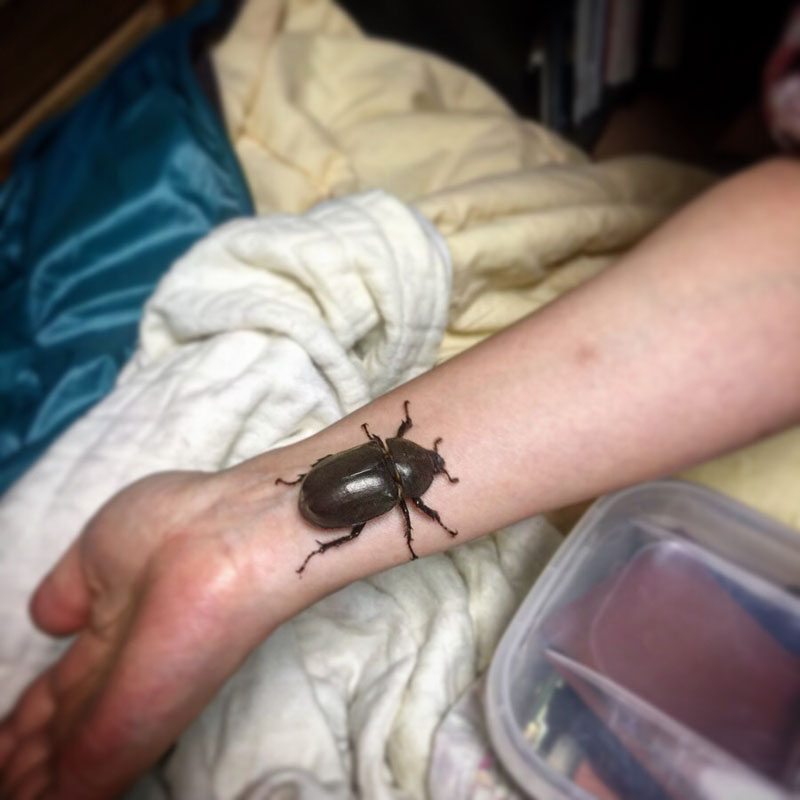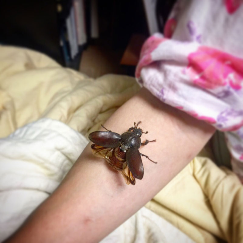 大きな羽音を立てて3階の網戸にメスのカブトムシ。