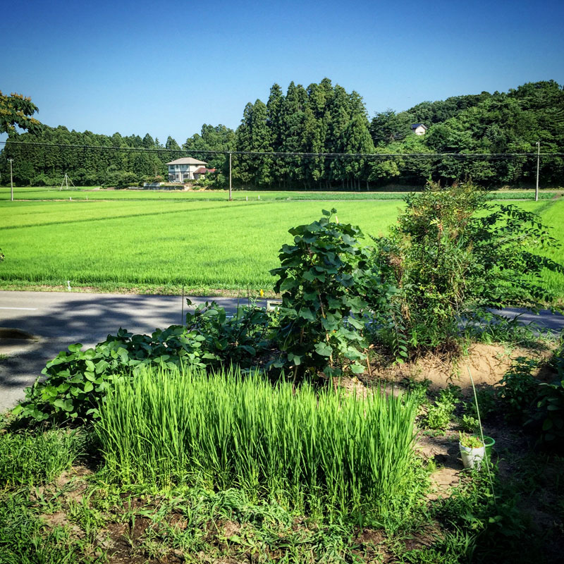 今日の庭の一畳田んぼと猫の額畑。「げんきまる」と言う品種の田んぼです。追肥した。