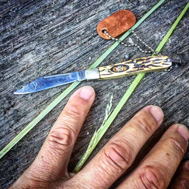 茎をナイフで削いで中を確認。順調に育って茎の中の稲は僕の小指と同じ長さ(約6センチ)まで育っている。