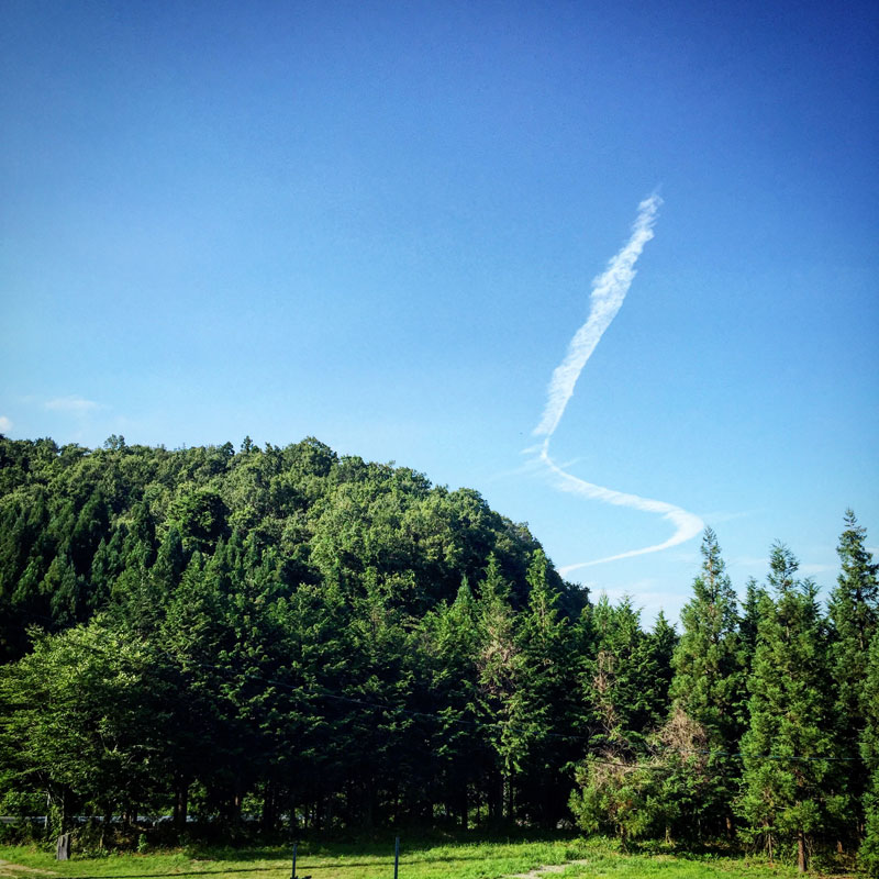 仕事場の上にへそ曲がりな飛行機雲。僕がへそ曲がりだからじゃないよ。