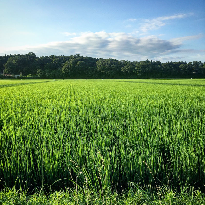 夕方の光に輝く田んぼ。