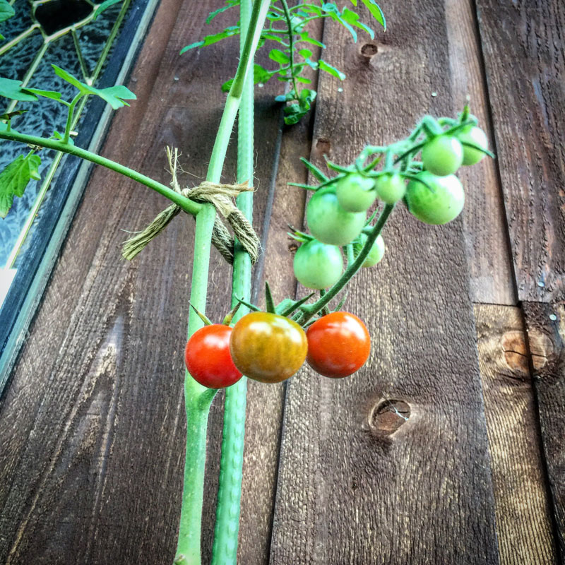 雨よけに玄関のウッドデッキの上に置いてあるミニトマト。