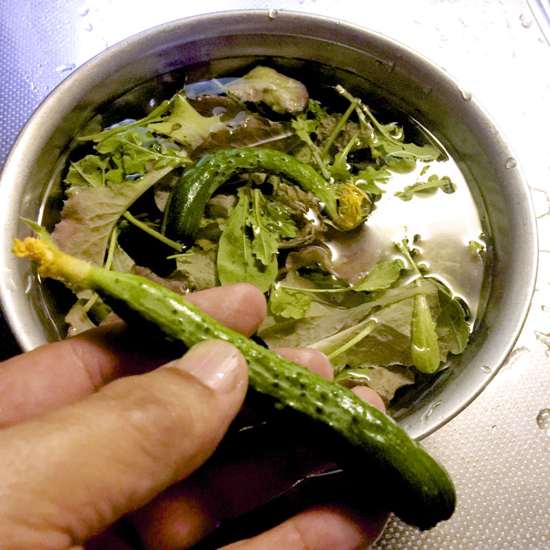 庭の畑のキュウリやルッコラなんかの葉物で今宵のサラダ。僕は虫を食べるのが怖いのでよく洗って数時間水につけておきます。売ってる半分の大きさでいただきます、キュウリ。