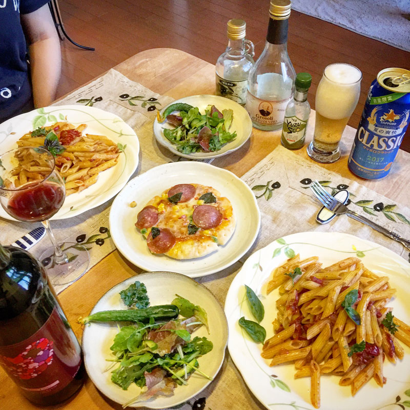 昨日、友だちのお百姓さんにもらった完熟のミニトマトで作ったトマトソースでパスタ作る。味見したら、お菓子か!って笑っちゃうほど甘くかったので、オリーブオイルに唐辛子の辛さを移してペンネアラビアータにした。パセリとかバジルとか、買うのは手間で大げさで、高くてもすぐ痛んでしまう野菜を、畑から摘んできて使える幸せ。6年ぶりに再開した畑のおかげで食卓が豊かだ。そんなmy 畑のサラダも。