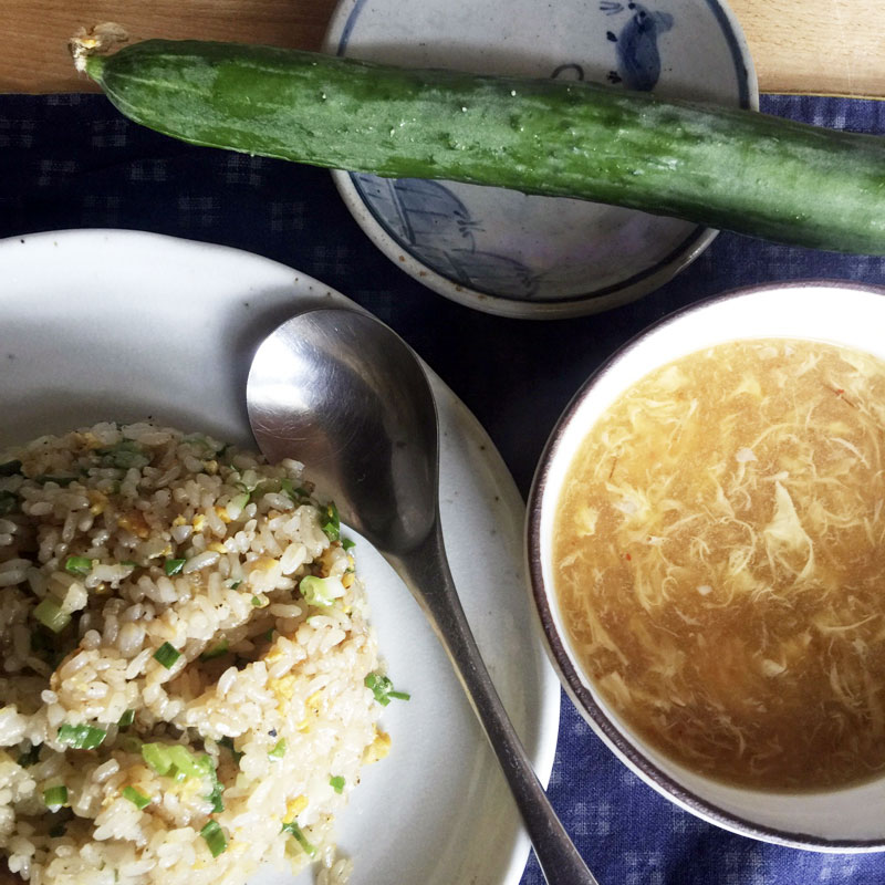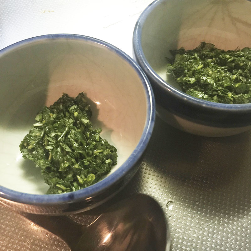 そこに熱々のスープを注ぐ。夏を実感するスープ。注ぐスープはチキンスープやコンソメでも。モロヘイヤを鍋で煮ないのが僕のレシピ。
