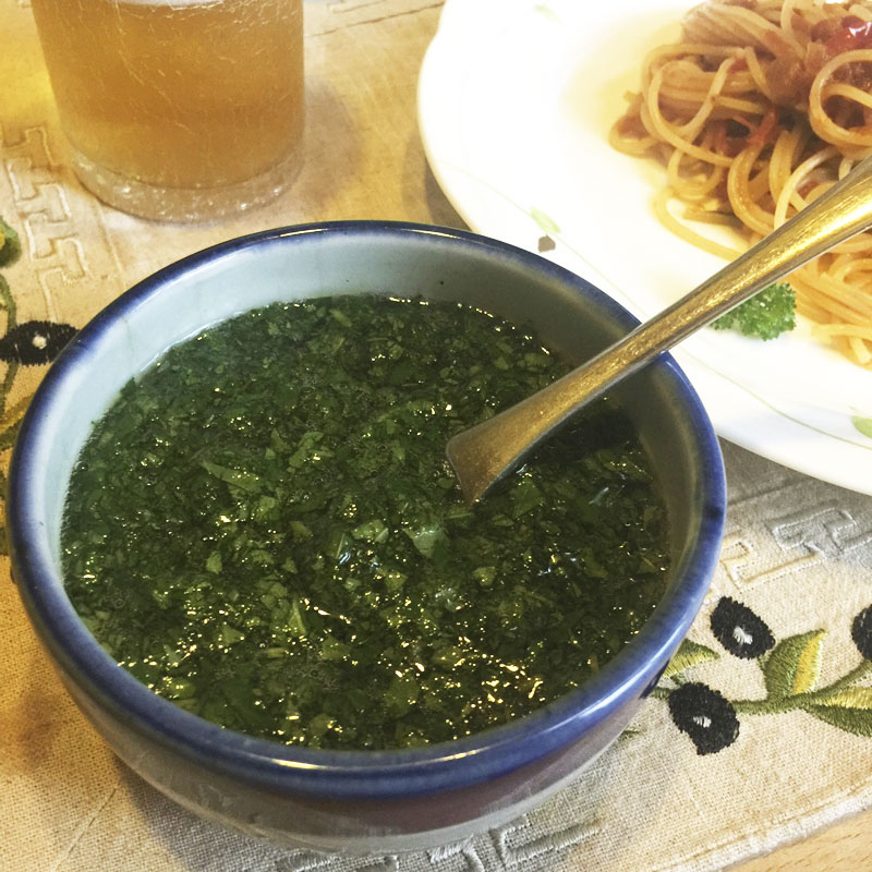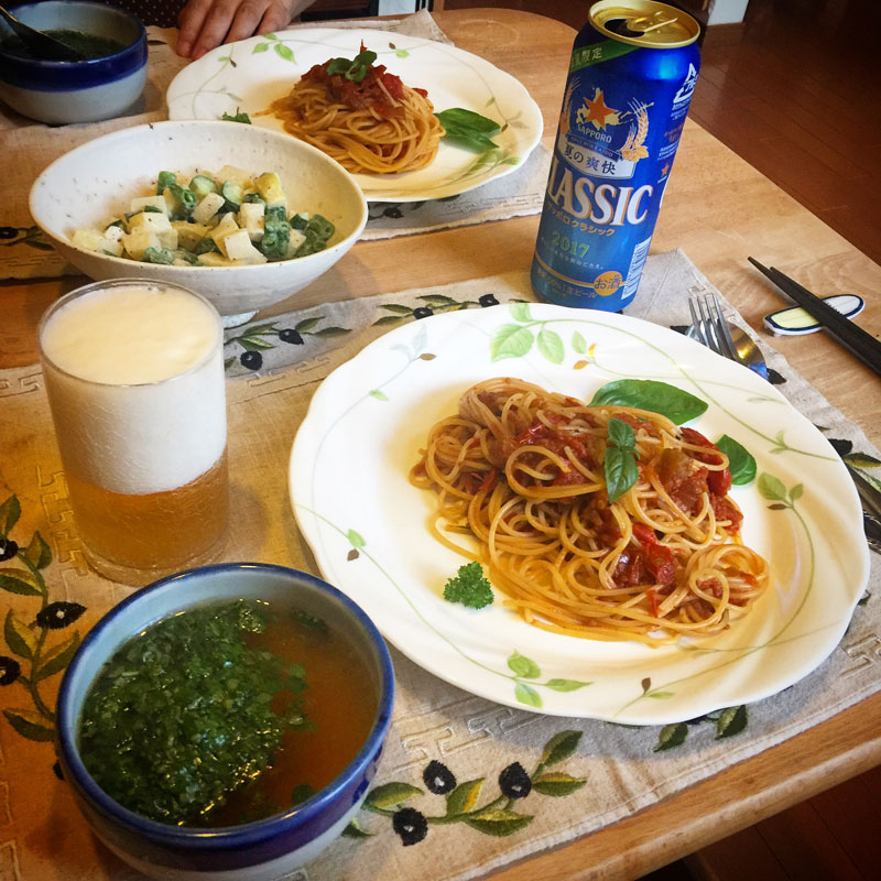 昨晩、飲んだ後に完熟トマトで作ったトマトソースのパスタ、畑から摘んできたモロヘイヤでスープ、エジプト風。幼馴染みがくれた北海道限定ビール。