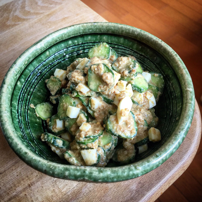 昼食に、また作った。きゅうりの胡麻和え。畑のきゅうりがどんどんできるので毎食のように作ってる。