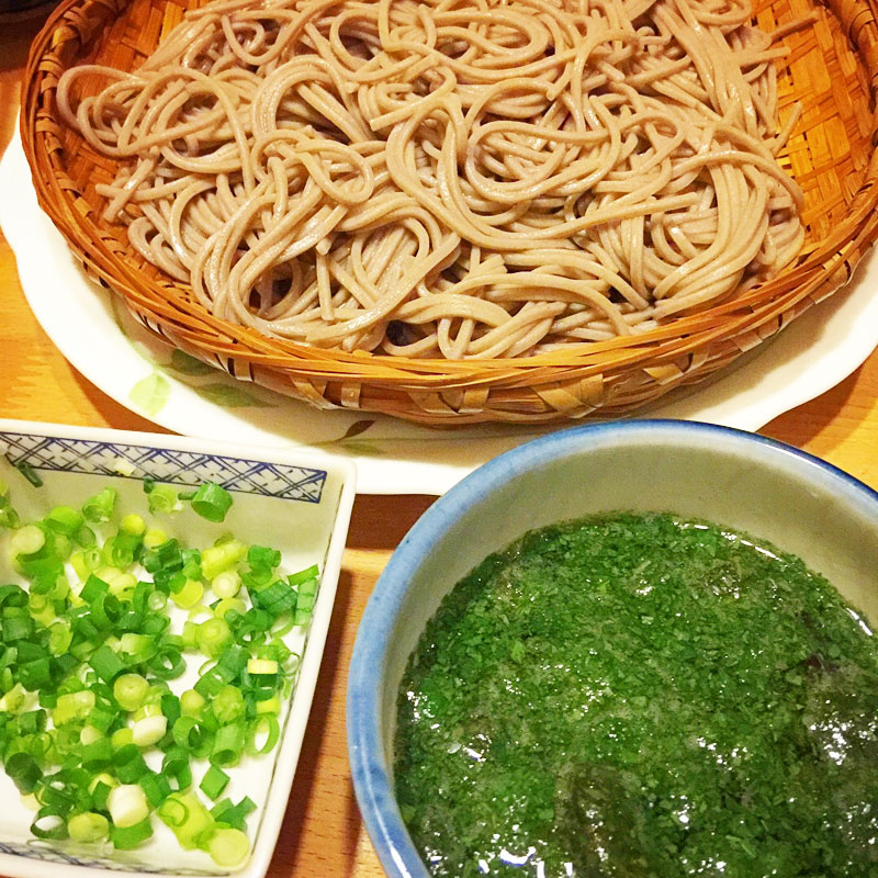 今宵はざるそばだっんだけど、思いついてお吸い物に入れたばかりで表面にフワフワ浮いていたモロヘイヤを、そばつゆに入れたら正解。