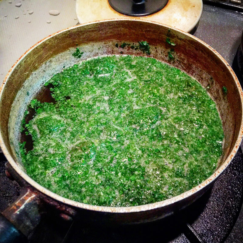 夕方、畑で摘んだばかりのモロヘイヤをいただいたので、叩いて叩いて粘りが出るまで叩いて、夕食にモロヘイヤのスープ作った。