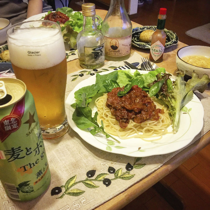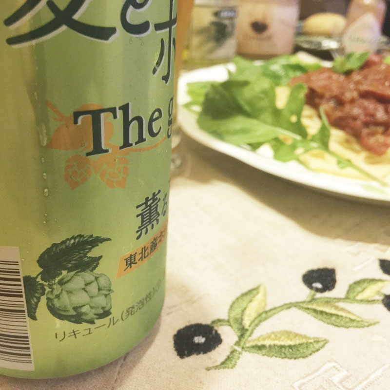 居酒屋我家、開店。カミさんが金曜日の夜、仕事で遅くなるようになったので、木、土、日曜日に営業予定です(笑)昨日の夜、作った完熟トマトのポモドーロ(というとかっこいいけど、茹でたパスタにトマトソースかけただけのパスタ)。旬の、それも木で完熟したトマトの力に改めて感動する美味しさ。皿の周りに庭の猫の額畑から千切ってきた、ルッコラやサラダ菜、バジル、パセリ。そして第3のビールはいつもの金麦ではなくて、@edamamet818kaorin さんが描かれたホップのイラストが缶のデザインに使われている「サッポロ 麦と東北のポップ The Gold 薫る夏」。
