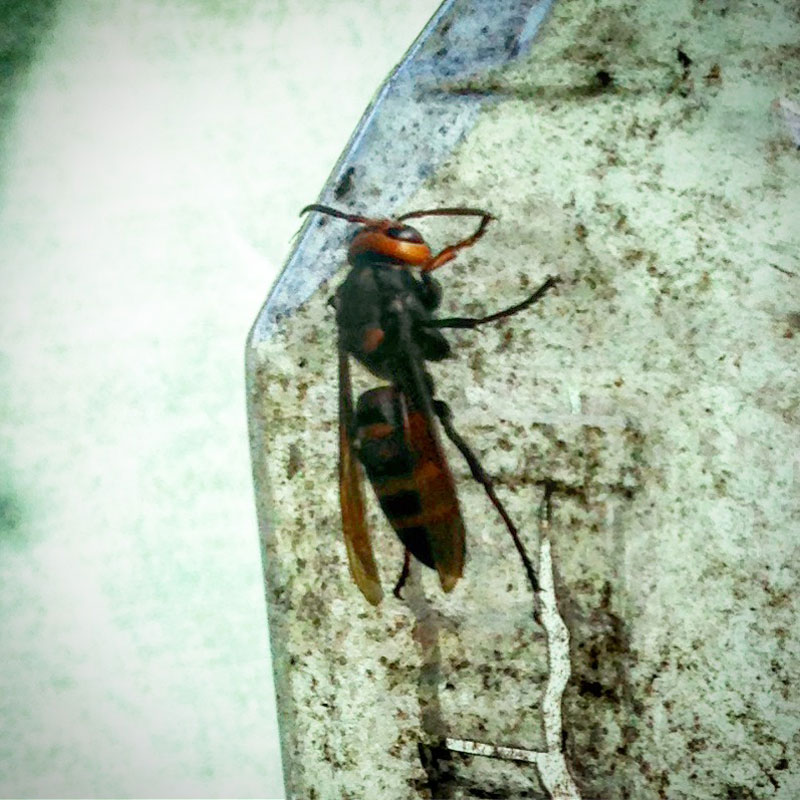 捕獲器からの脱出に成功したスズメバチ。捕まるか、山に帰るかしてくれないと怖くて石を彫れないよ!でかいし、捕まった4匹の羽音も怖い。