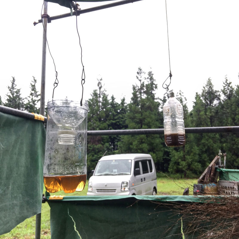 仕事場のテント下にもうひとつコンパクトなスズメバチ捕獲機吊るした。前のものも一度洗ってから誘引剤を入れ直した。