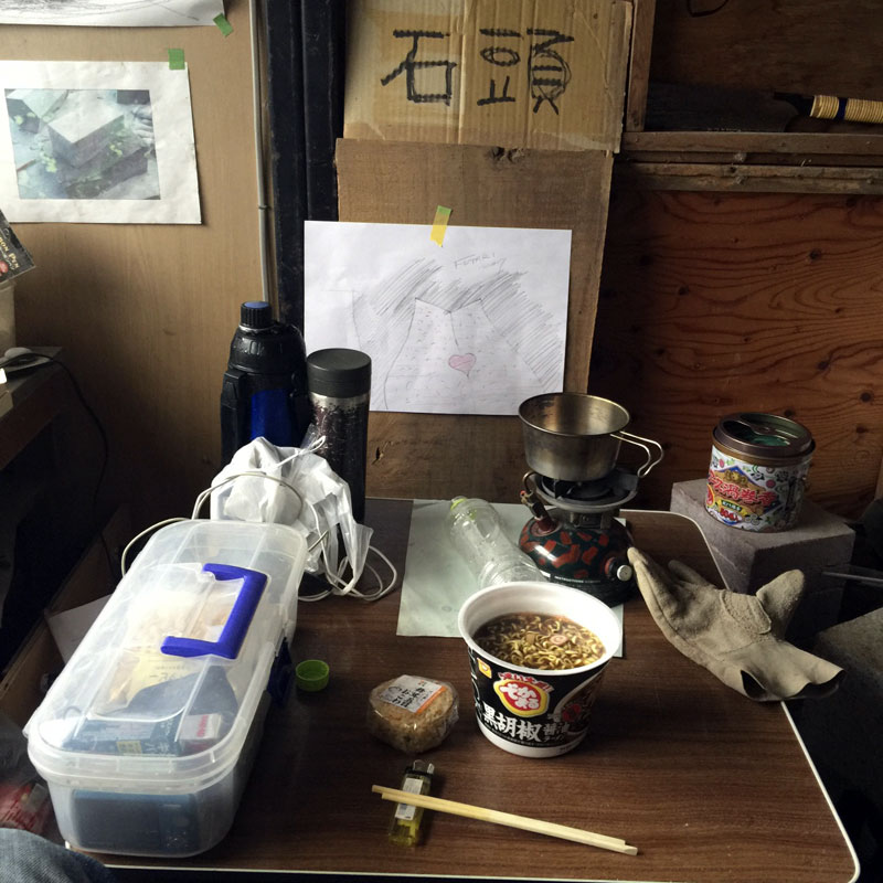 雨が降り続く。道具置き場のプレハブでカップヌードルとコンビニおにぎりのジャンクフードのランチ。