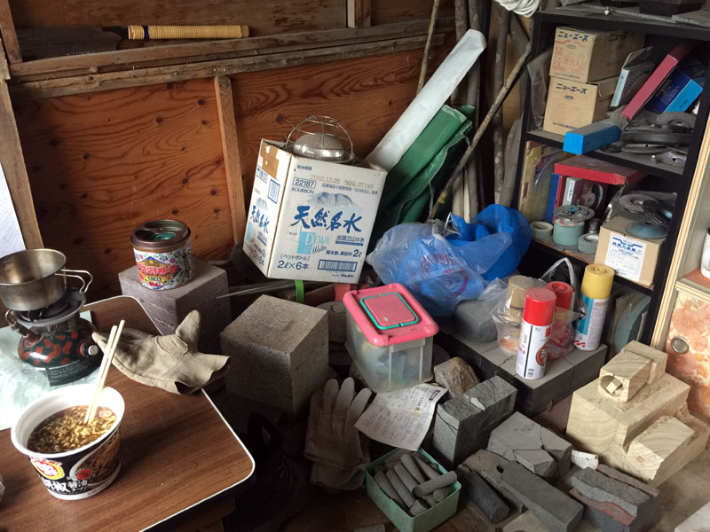 在庫や道具や消耗品や石の粉や雨水や、、、でも雨をしのいでごちそうさま。