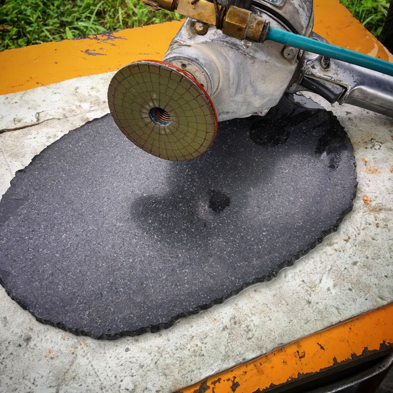 若い時はピカピカの鏡のような鏡面仕上げばかりだったけど、今は黒御影石をしっとり濡れているように仕上げるのが好き。台座の磨き完成。