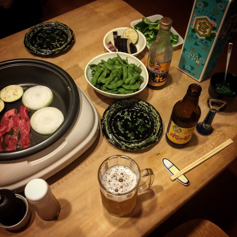 居酒屋我家、開店。ホットプレートでの焼き物とホッピー。