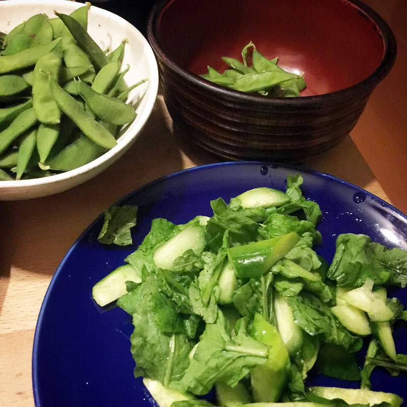 畑のだだちゃ豆、茹でたら家中に甘い香りが満ちてる。ルッコラとキュウリのサラダ。