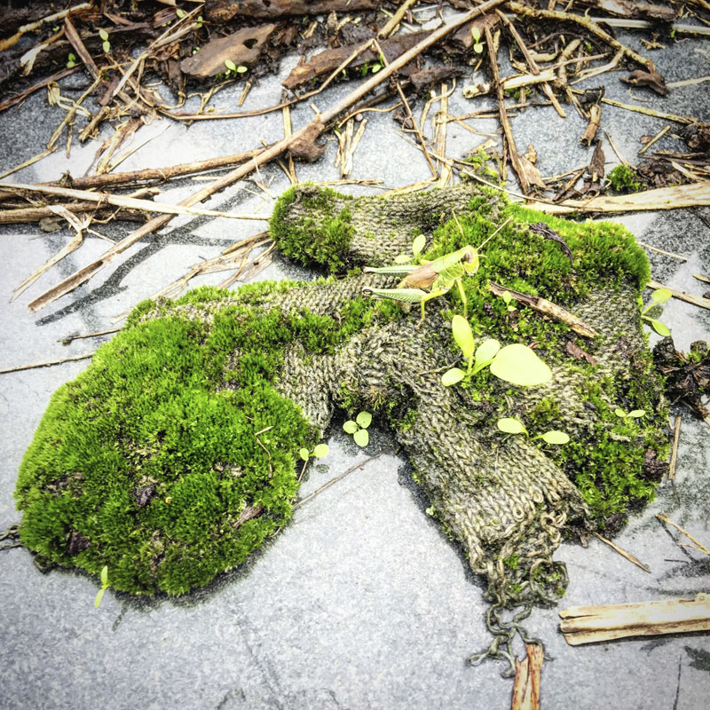 軍手島w 黒御影石の上に置き忘れた軍手に苔が根付いてまるで離れ小島みたい。
