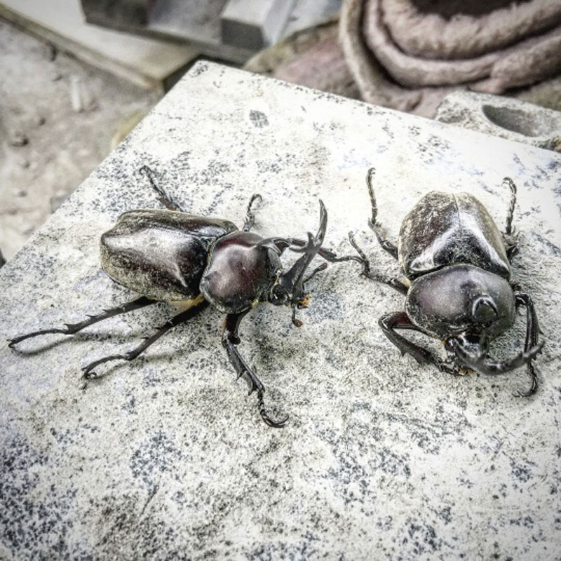 仕事場のテントの下にカブトムシ。石の粉だらけになるよ。それにしてもカブトムシを見るとテンション上がるのは子どもの頃からの名残だろうか。