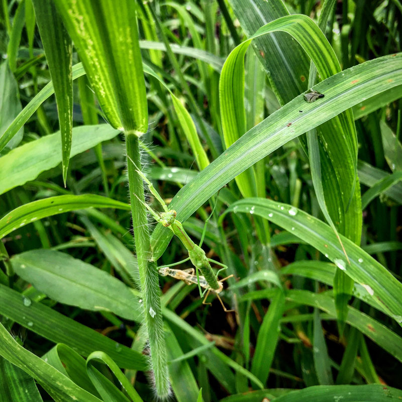 庭の草につかまって、脱皮が完了直後の小さなカマキリ君。