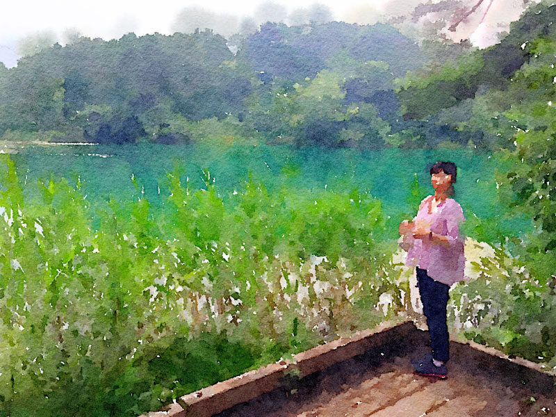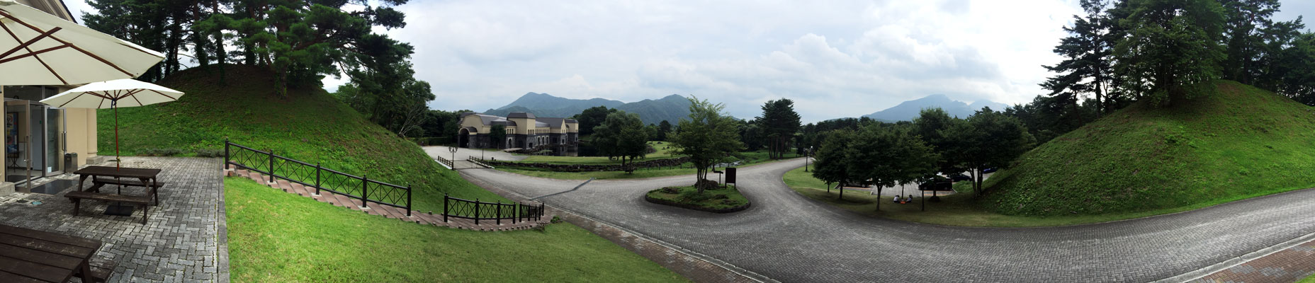 諸橋美術館へ。広い広い敷地のたくさんの芝生。草刈り機を使わずに女性が手に持った鎌で高さを揃えていた。刃を研ぎながら。(※この写真、クリックで拡大します)
