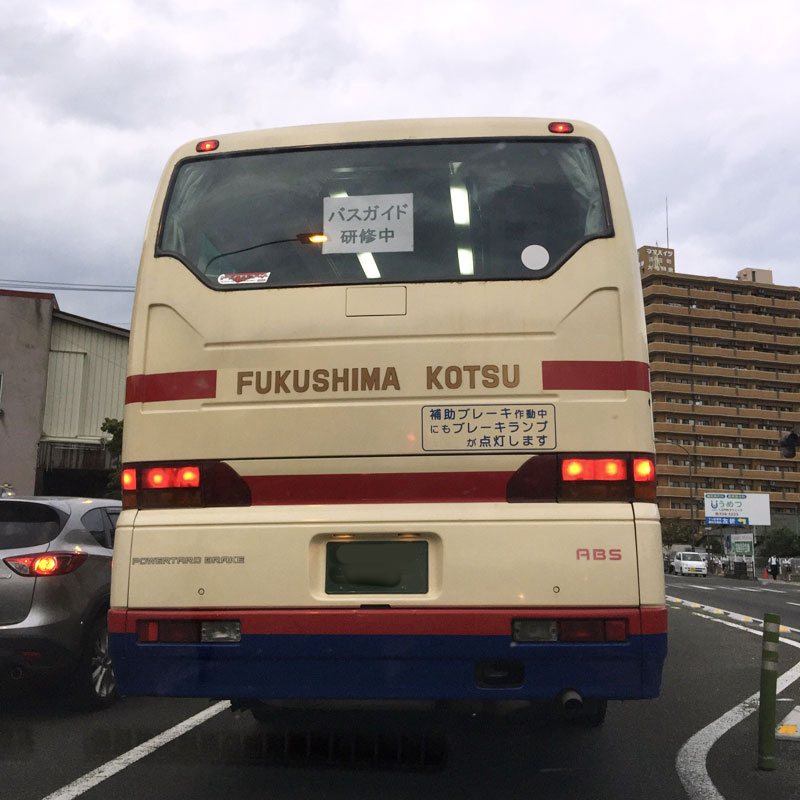 高速使わなくても2時間半なので、下道で帰る。前の安全運転のバスのガラスに「バスガイド研修中」の張り紙。
