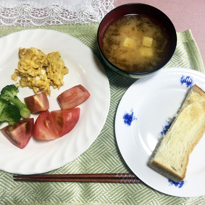 味噌汁とサラダとパンの、いつもの実家の朝食。2日間、朝食を食べてしまった。
