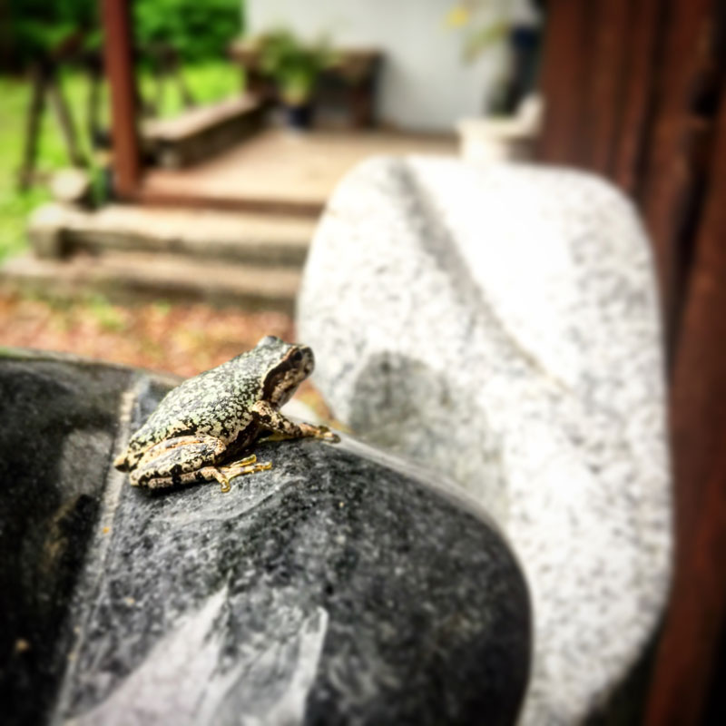 家の前に設置してある石彫の上のアマガエル。黒御影石の上に乗ってたので体が黒っぽい色に変わってる。