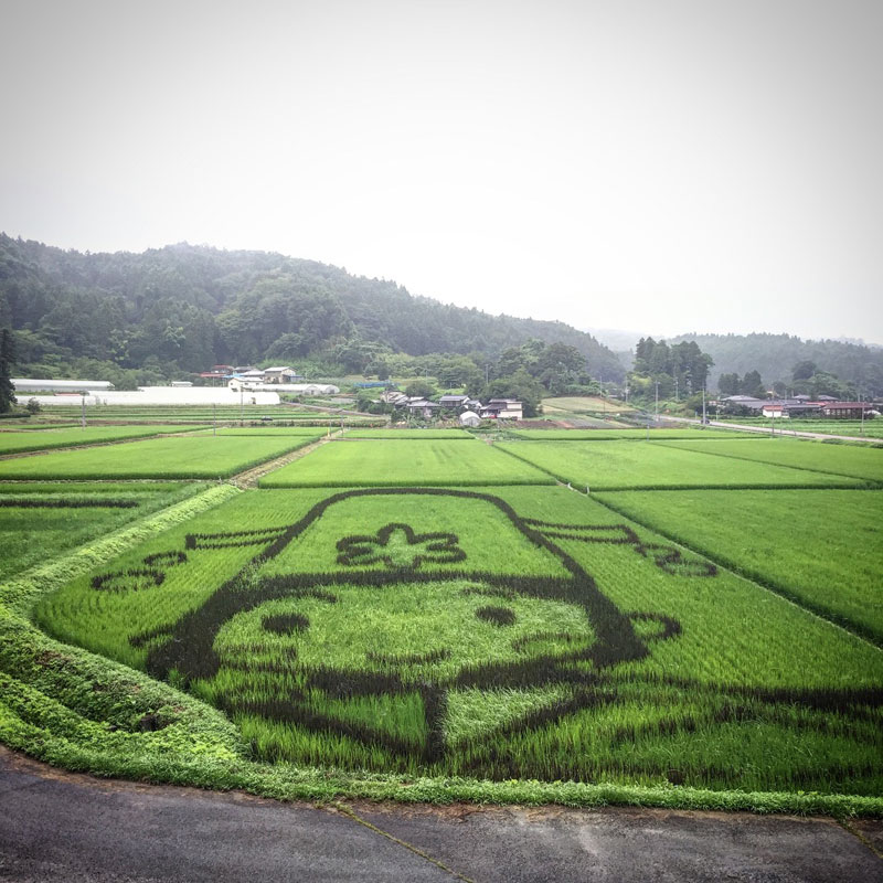 霧雨の朝、仕事場へ行く途中にある田んぼアートに寄ってみる。今の場所でやる前の山奥で友だちのお百姓さんたちが始めてから、もう10年以上だ。(例えば、今の場所に移る前、2010年の山の中の田んぼアートにブリヤート共和国の若者ふたりと見に行ったな)