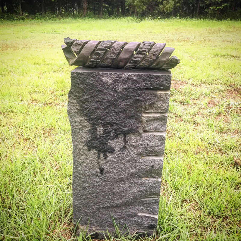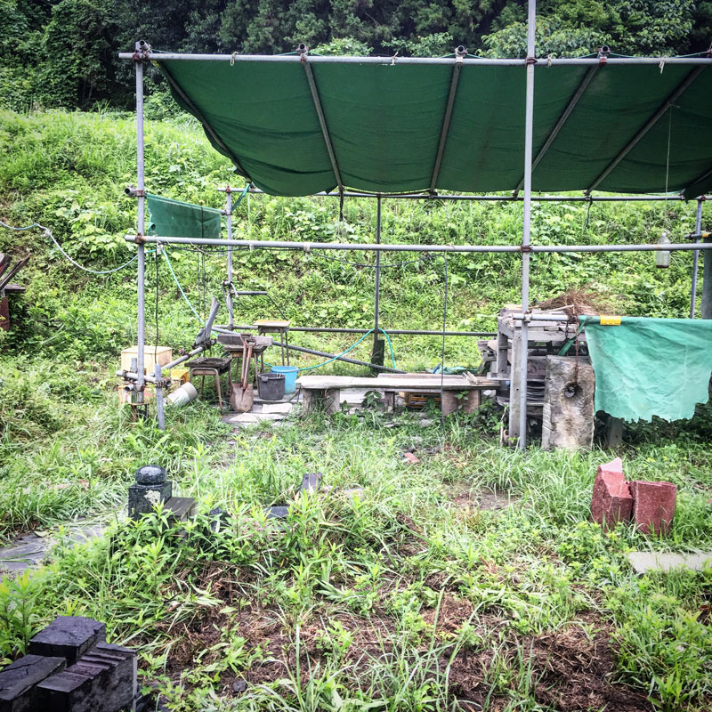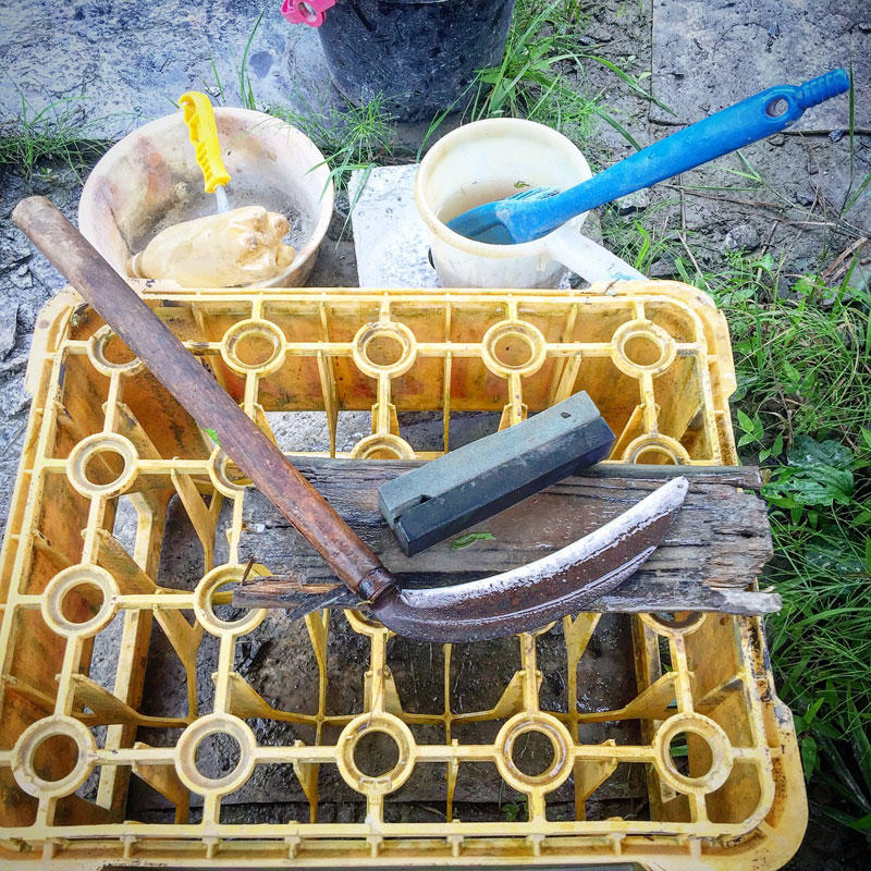 仕事場に在庫してる石が、一雨で一気に伸びた草に飲み込まれてしまったので、鎌を研ぐ。草刈機では石と石の隙間を刈れないし、石に刃を当ててすぐにダメになる。